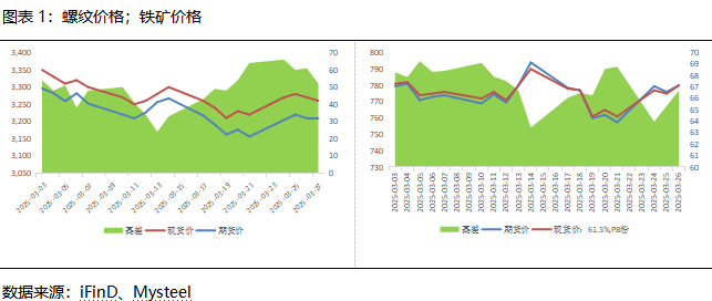 3月以来,钢矿价格震荡下行,均创下阶段性新低,截至3月27日,螺纹和铁矿主力合约分别跌至3208元/吨和789元/吨,较月初下跌3.61%和1.31%。本轮下跌既有国内宏观利好落地,海外对我国钢材出口加征关税导致预期转弱的影响,也有终端需求回升缓慢、原料供应宽松导致基本面欠佳的因素。由于铁水处于复产周期,铁矿需求存在韧性,走势强于螺纹。目前黑链已经进入金三银四,旺季需求的成色成为后续的主要驱动。