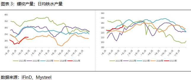 钢厂在经历过近两年普遍亏损的情况后,改变了以往通过抢占市场来过度追踪利润的策略,开始把生存放在首位,转为以销定产策略为主,维持现金流稳定。由于今年终端需求不佳,钢厂复产相对谨慎,1-2月粗钢累计产量1.66亿吨,同比下降1.5%。不过从利润角度来看,当前炼钢利润超过100元/吨,较去年亏损超100元/吨的情况明显好转,钢厂仍存在增产意愿,3月底螺纹产量227.43万吨,环比增加1.22万吨,产量已经超过去年同期水平。后续,电炉随着利润收缩,华东谷电利润处于盈亏边缘,增产积极性有限。高炉在利润的驱动下,以及根据高炉停复产计划,依然存在增量预计,后续钢材产量或稳中有升。