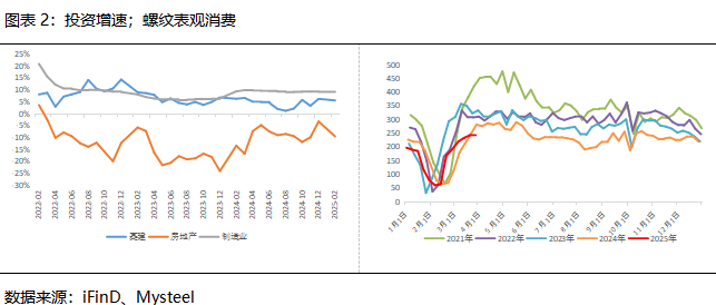 3月两会圆满落幕,今年将实施更加积极的财政政策和适度宽松的货币政策,赤字率、专项债、特别国债目标均有提高,在宽松的宏观政策背景下,全国固定资产投资保持高速增长,分领域看,1-2月基础设施建设投资(不含电力)增速5.6%,制造业投资增速9%。但是房地产的拖累延续,房地产开发投资增速-9.8%,其中,商品房销售面积增速-5.48%,较去年11、12月当月值再次转负,新开工面积增速-29.85%大幅下降,说明房地产依旧处于调整周期,对用钢需求的压制仍在。
