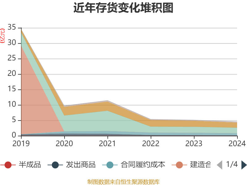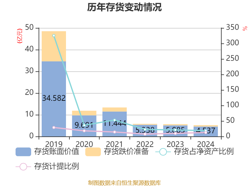 从存货变动来看,截至2024年末,公司存货账面价值为4.54亿元,占净资产的18.46%,较上年末减少5477.71万元。其中,存货跌价准备为6485.83万元,计提比例为12.51%。