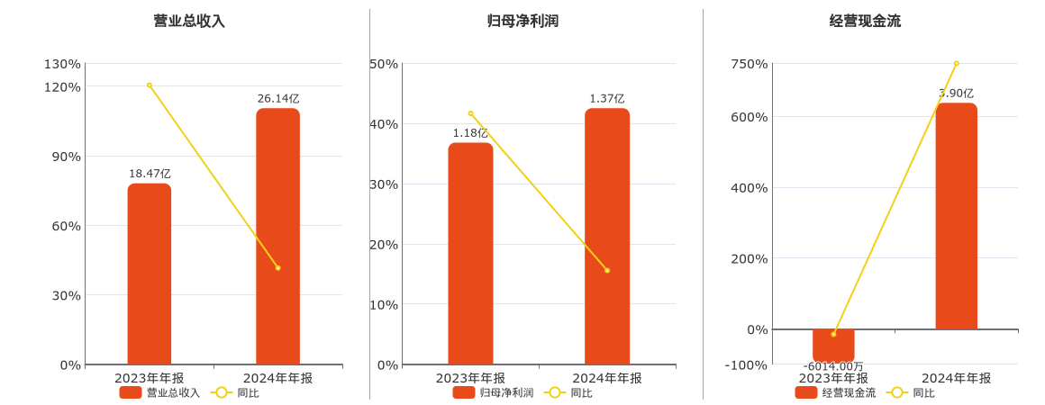 公司营业总收入为26.14亿元,较去年同报告期营业总收入增加7.67亿元,实现4年连续上涨,同比较去年同期上涨41.53%。归母净利润为1.37亿元,较去年同报告期归母净利润增加1837.47万元,实现2年连续上涨,同比较去年同期上涨15.54%。经营活动现金净流入为3.90亿元,较去年同报告期经营活动现金净流入增加4.50亿元。