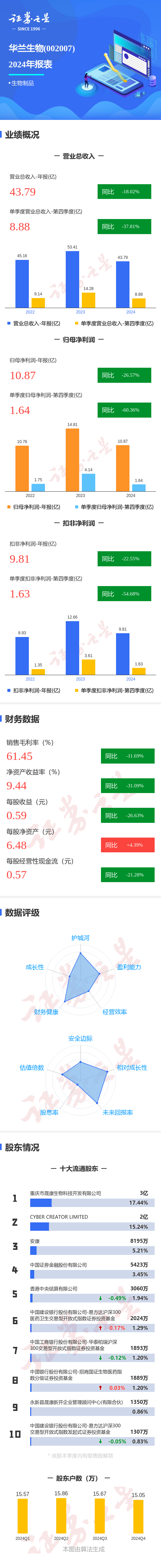 证券之星消息,华兰生物2024年年报显示,公司主营收入43.79亿元,同比下降18.02%;归母净利润10.88亿元,同比下降26.57%;扣非净利润9.81亿元,同比下降22.56%;其中2024年第四季度,公司单季度主营收入8.89亿元,同比下降37.82%;单季度归母净利润1.64亿元,同比下降60.37%;单季度扣非净利润1.64亿元,同比下降54.69%;负债率15.1%,投资收益1.38亿元,财务费用-684.28万元,毛利率61.45%。