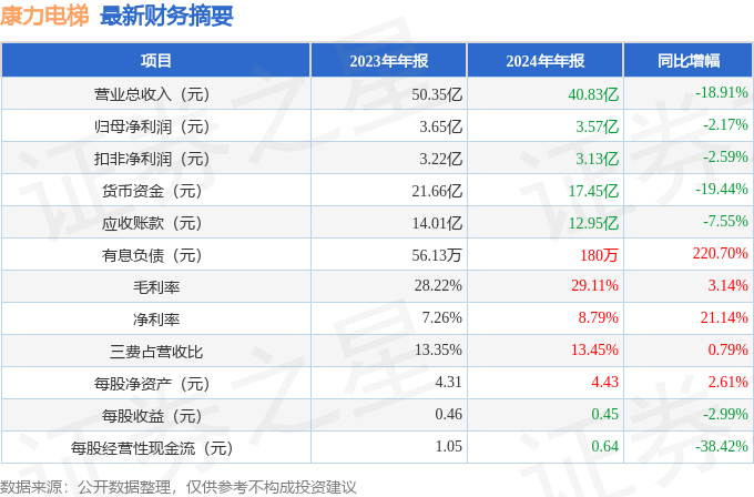据证券之星公开数据整理,近期康力电梯(002367)发布2024年年报。截至本报告期末,公司营业总收入40.83亿元,同比下降18.91%,归母净利润3.57亿元,同比下降2.17%。按单季度数据看,第四季度营业总收入12.06亿元,同比下降21.15%,第四季度归母净利润7547.27万元,同比上升413.08%。本报告期康力电梯盈利能力上升,毛利率同比增幅3.14%,净利率同比增幅21.14%。