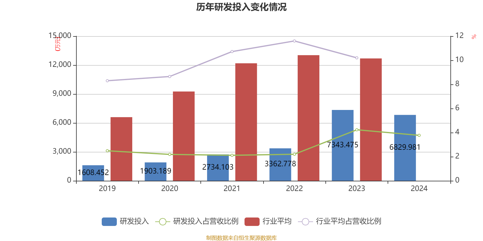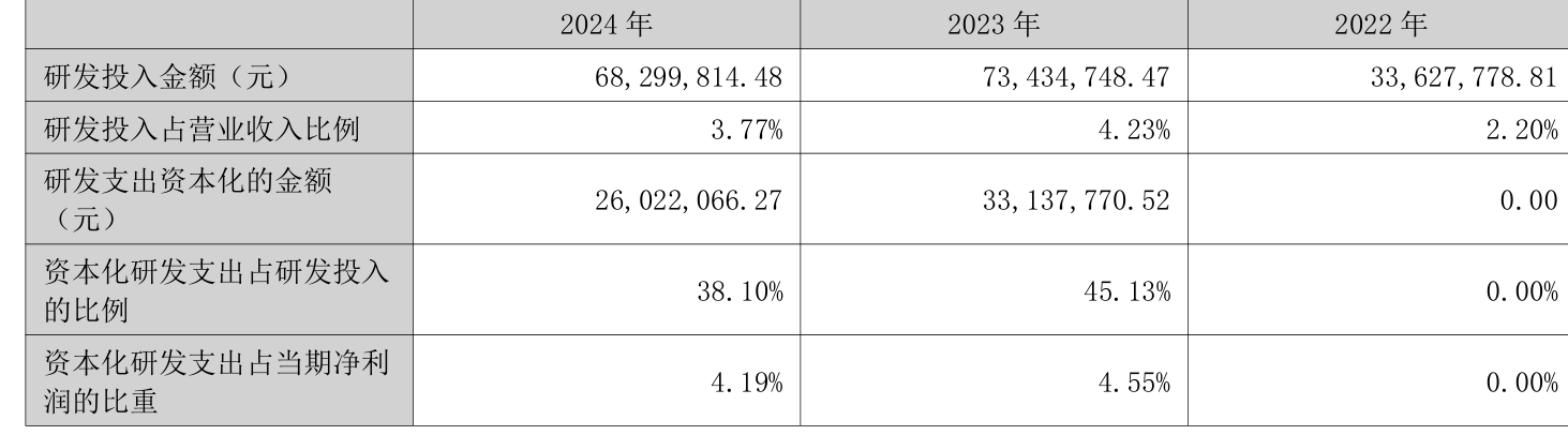 2024年全年,公司研发投入金额为6829.98万元,同比下降6.99%;研发投入占营业收入比例为3.77%,相比上年同期下降0.46个百分点。此外,公司全年研发投入资本化率为38.1%。