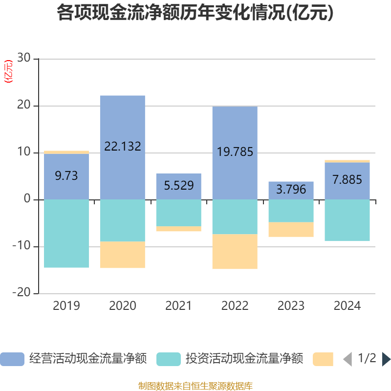截至2024年,公司经营活动现金流净额为7.89亿元,同比增长107.75%;筹资活动现金流净额4984.84万元,同比增加3.63亿元;投资活动现金流净额-8.86亿元,上年同期为-4.87亿元。