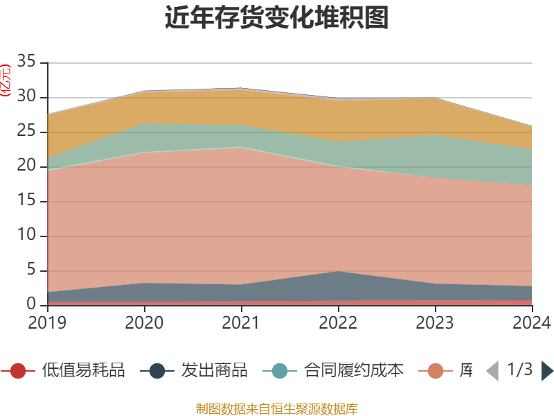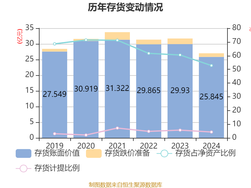 从存货变动来看,截至2024年末,公司存货账面价值为25.85亿元,占净资产的52.79%,较上年末减少4.08亿元。其中,存货跌价准备为1.15亿元,计提比例为4.26%。