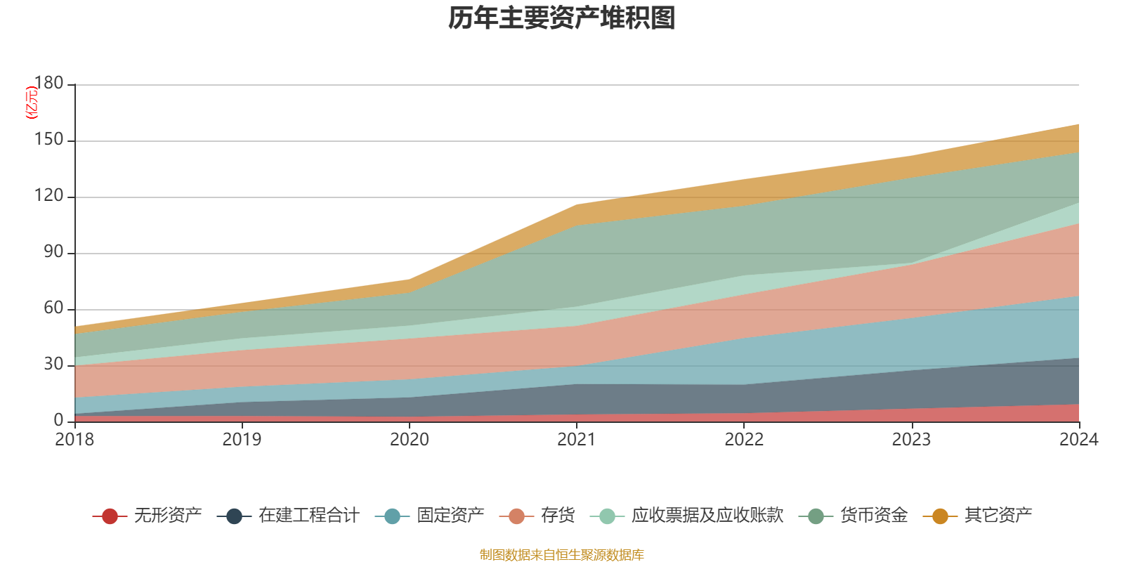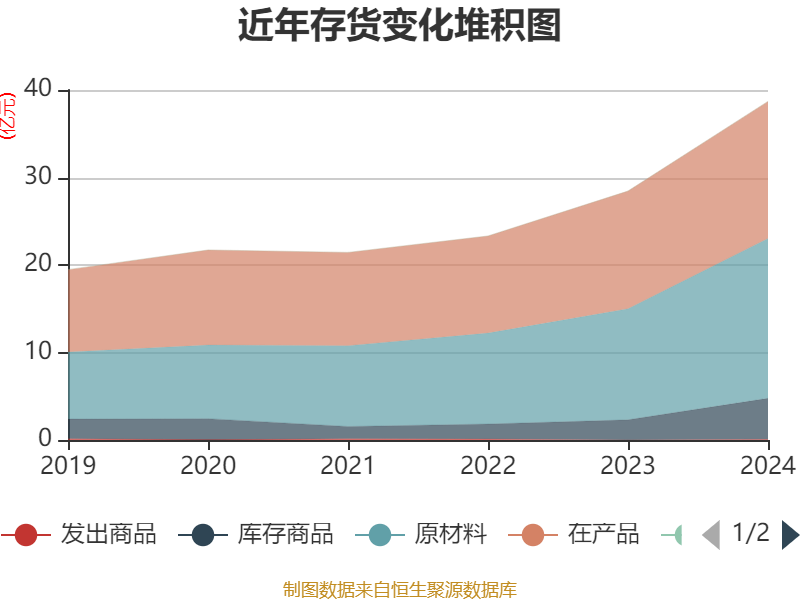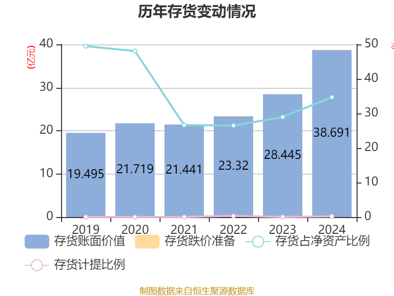 从存货变动来看,截至2024年末,公司存货账面价值为38.69亿元,占净资产的34.74%,较上年末增加10.25亿元。其中,存货跌价准备为815.71万元,计提比例为0.21%。