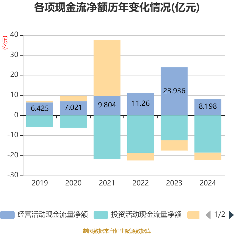 截至2024年,公司经营活动现金流净额为8.2亿元,同比下降65.75%;筹资活动现金流净额-3.7亿元,同比增加1.38亿元;投资活动现金流净额-18.59亿元,上年同期为-12.47亿元。