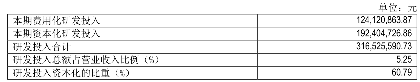 2024年全年,公司研发投入金额为3.17亿元,同比增长21.14%;研发投入占营业收入比例为5.25%,相比上年同期上升0.21个百分点。此外,公司全年研发投入资本化率为60.79%。