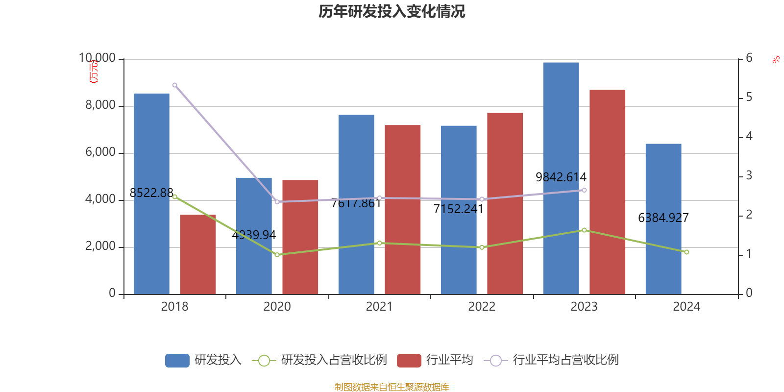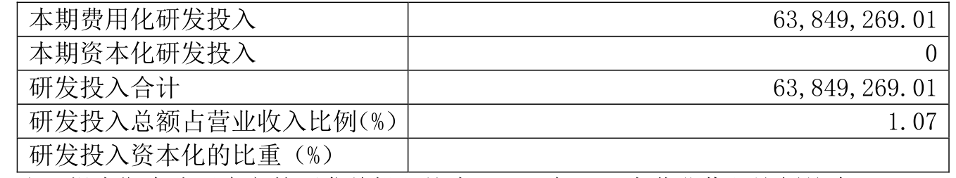2024年全年,公司研发投入金额为6384.93万元,同比下降35.13%;研发投入占营业收入比例为1.07%,相比上年同期下降0.56个百分点。此外,公司全年研发投入资本化率为0%。