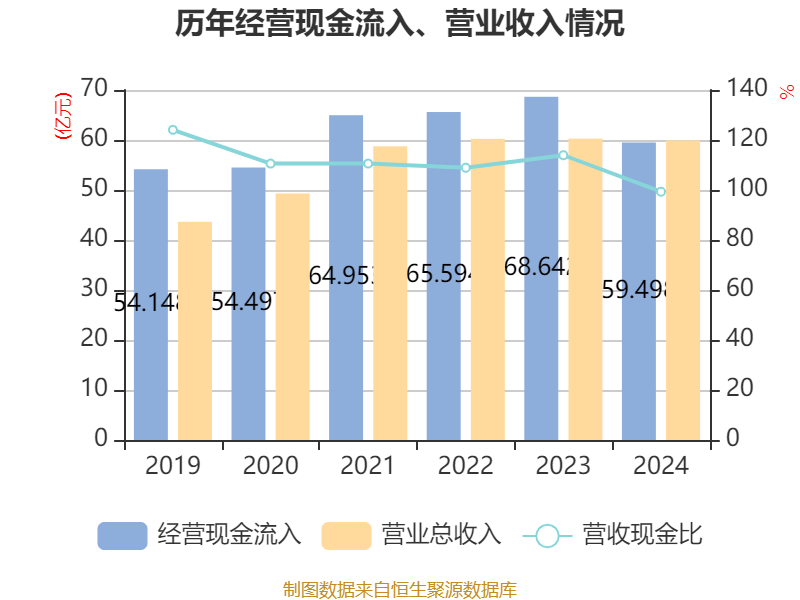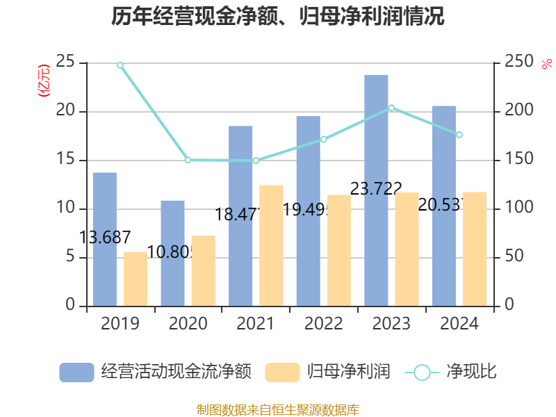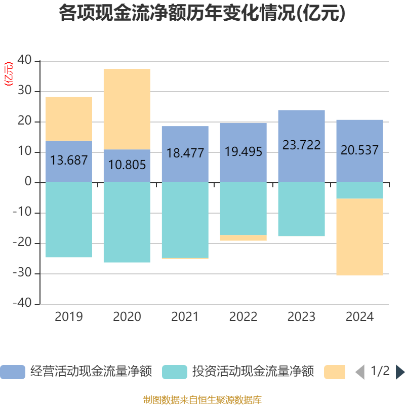 截至2024年,公司经营活动现金流净额为20.54亿元,同比下降13.42%;筹资活动现金流净额-25.27亿元,同比减少25.23亿元;投资活动现金流净额-5.41亿元,上年同期为-17.72亿元。