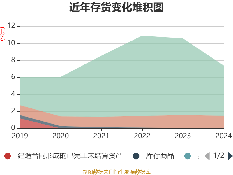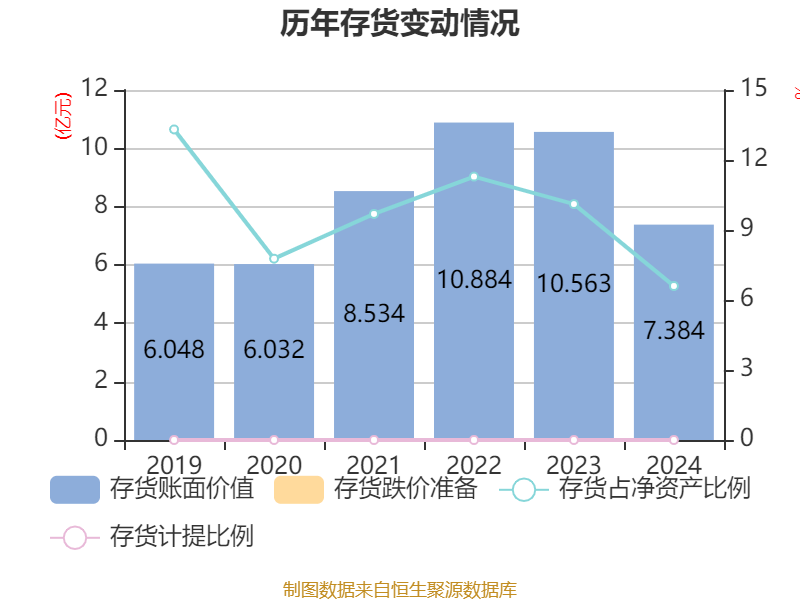 从存货变动来看,截至2024年末,公司存货账面价值为7.38亿元,占净资产的6.6%,较上年末减少3.18亿元。公司本期没有计提存货跌价准备。