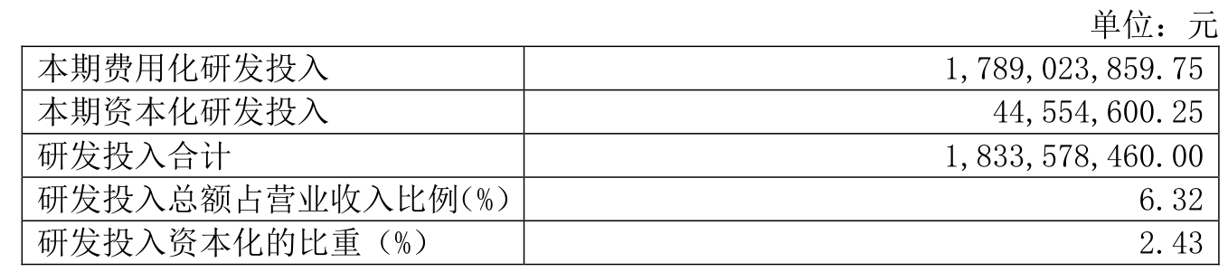 2024年全年,公司研发投入金额为18.34亿元,同比增长7.48%;研发投入占营业收入比例为6.32%,相比上年同期上升0.65个百分点。此外,公司全年研发投入资本化率为2.43%。