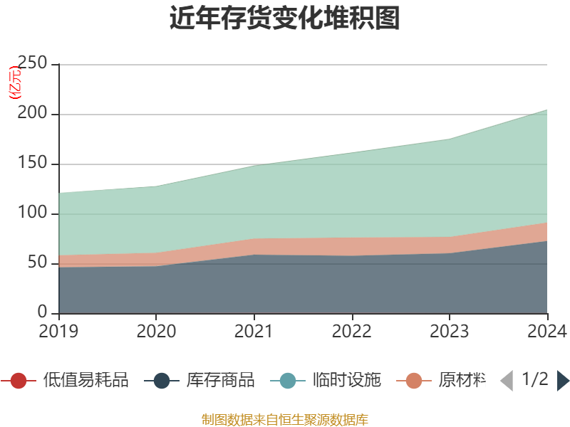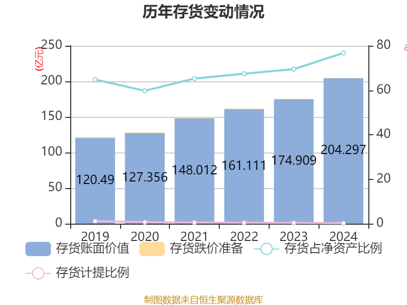 从存货变动来看,截至2024年末,公司存货账面价值为204.3亿元,占净资产的76.74%,较上年末增加29.39亿元。其中,存货跌价准备为4949.7万元,计提比例为0.24%。