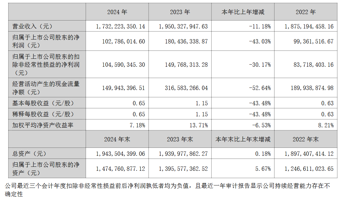 其中第四季度,公司营业收入为4.29亿元,同比下降8.5%;归母净利润为2161万元,同比下降42.2%。截至2024年四季度末,公司总资产19.44亿元,较上年度末增长0.2%;归母净资产为14.75亿元,较上年度末增长5.7%。