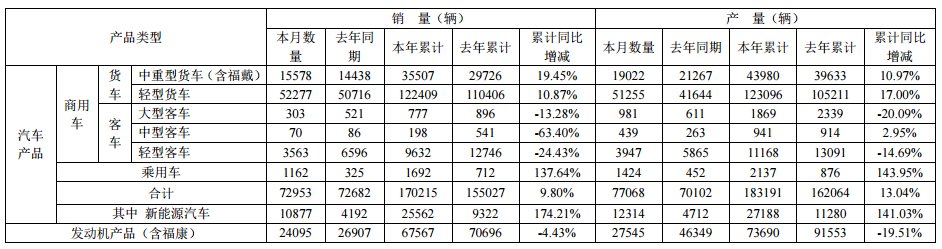 4月9日,福田汽车发布3月份产销数据快报。当月汽车产品总销量为72,953辆,较去年同期的72,682辆增长0.37%;产量为77,068辆,同比增长9.93%。其中,新能源汽车表现尤为亮眼,单月销量达10,877辆,同比大幅增长174.21%;乘用车销量1,162辆,同比上升137.64%。