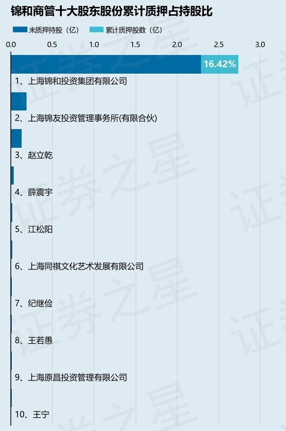 截止本公告日,股东上海锦和投资集团有限公司已累计质押股份4500.0万股,占其持股总数的16.42%。本次质押后锦和商管十大股东的累计质押股份占持股比例(占持股比例的计算以公司最新一期财务报表公布的十大股东的持股总数为基准)见下图: