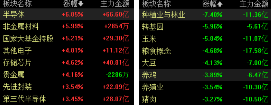 盘面上,半导体产业链掀涨停潮,超硬材料、卫星导航概念强劲补涨,医药、机器人、高铁板块表现活跃;反关税概念大幅回调,离境退税概念尾盘走弱,乳业、白酒、煤炭股普遍低迷。