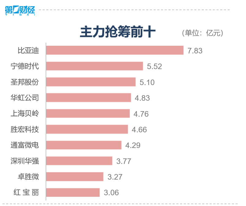 具体到个股来看,比亚迪、宁德时代、圣邦股份获净流入7.83亿元、5.52亿元、5.10亿元。