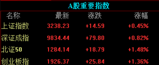 4月11日,三大股指集体收涨,上证指数报收3238.23点,涨0.45%;深成指报收9834.44点,涨0.82%;创业板指报收1926.37点,涨1.36%。