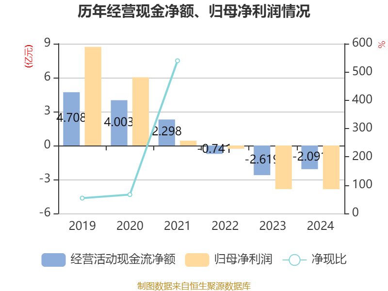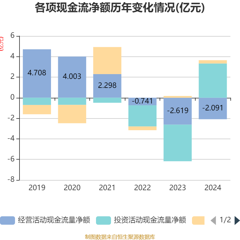 截至2024年,公司经营活动现金流净额为-2.09亿元,同比增加5278.07万元;筹资活动现金流净额3208.92万元,同比增加1522.98万元;投资活动现金流净额3.33亿元,上年同期为-3.56亿元。