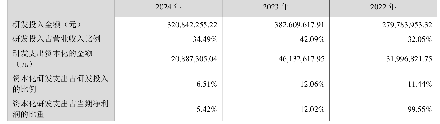2024年全年,公司研发投入金额为3.21亿元,同比下降16.14%;研发投入占营业收入比例为34.49%,相比上年同期下降7.6个百分点。此外,公司全年研发投入资本化率为6.51%。
