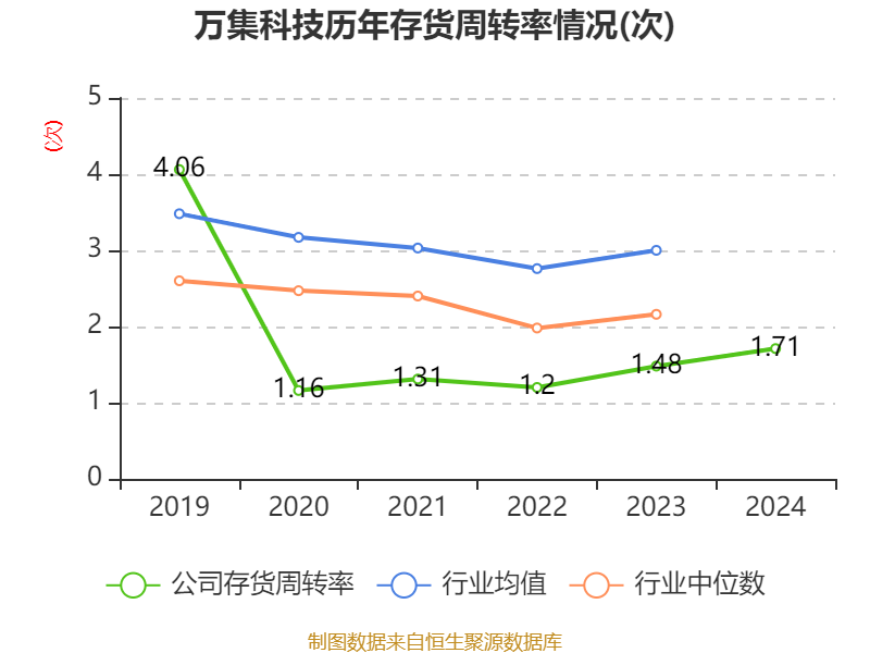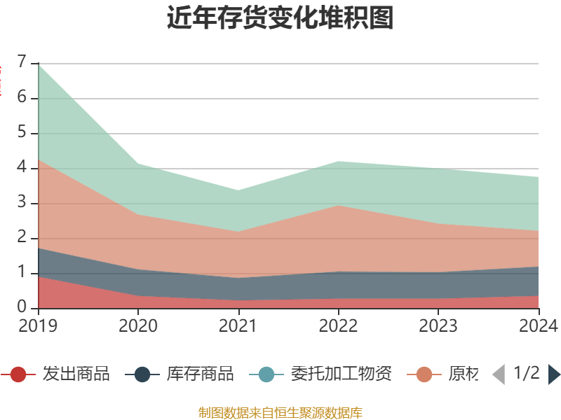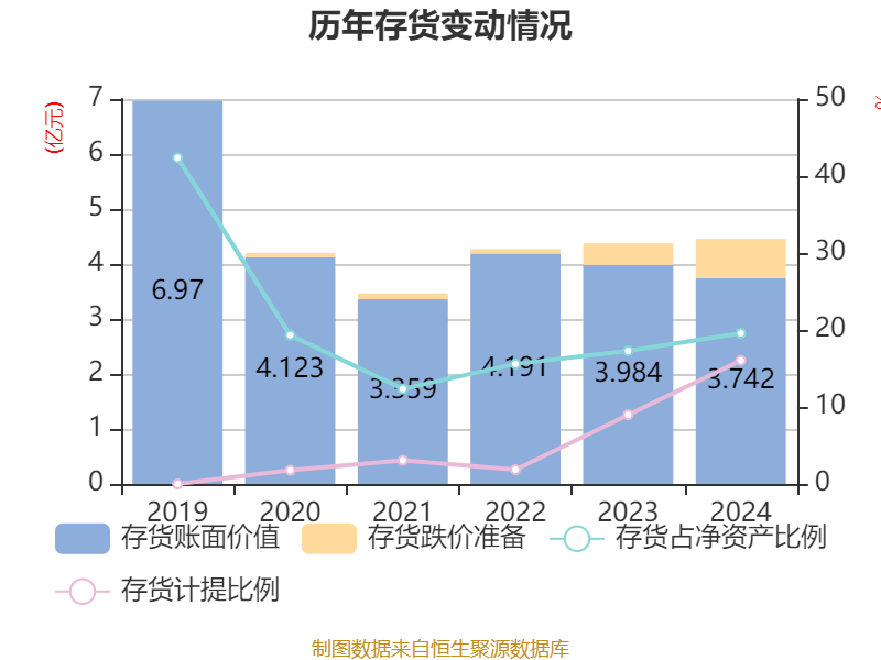 从存货变动来看,截至2024年末,公司存货账面价值为3.74亿元,占净资产的19.57%,较上年末减少2418.47万元。其中,存货跌价准备为7150.99万元,计提比例为16.04%。