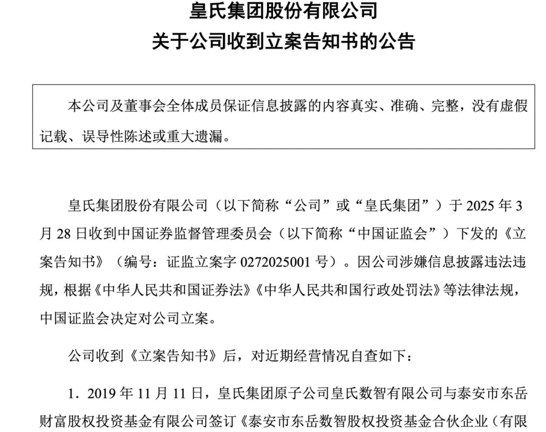 据皇氏集团3月31日晚发布的公告,3月28日收到中国证监会下发的《立案告知书》,因涉嫌信息披露违法违规,中国证监会决定对公司立案。