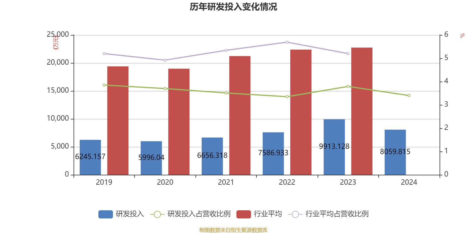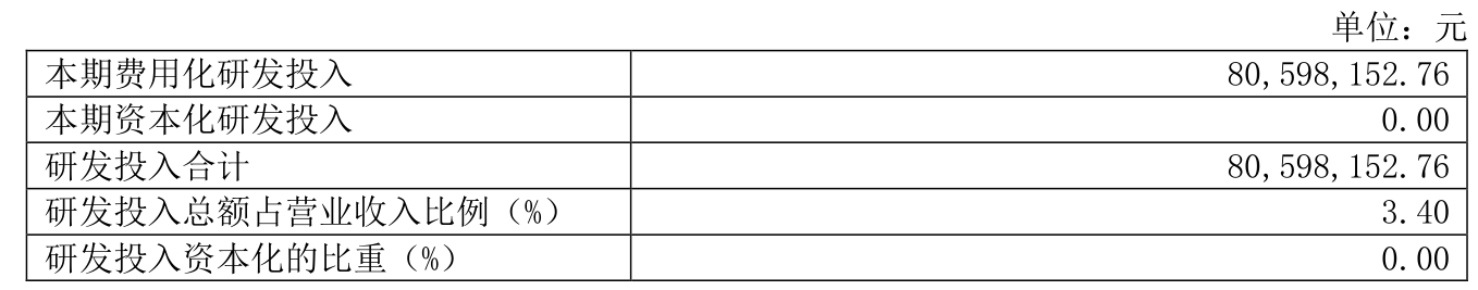 2024年全年,公司研发投入金额为8059.82万元,同比下降18.7%;研发投入占营业收入比例为3.4%,相比上年同期下降0.39个百分点。此外,公司全年研发投入资本化率为0%。
