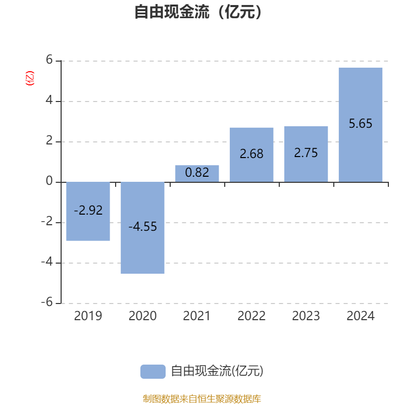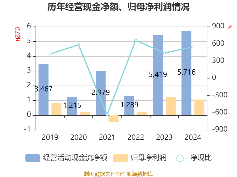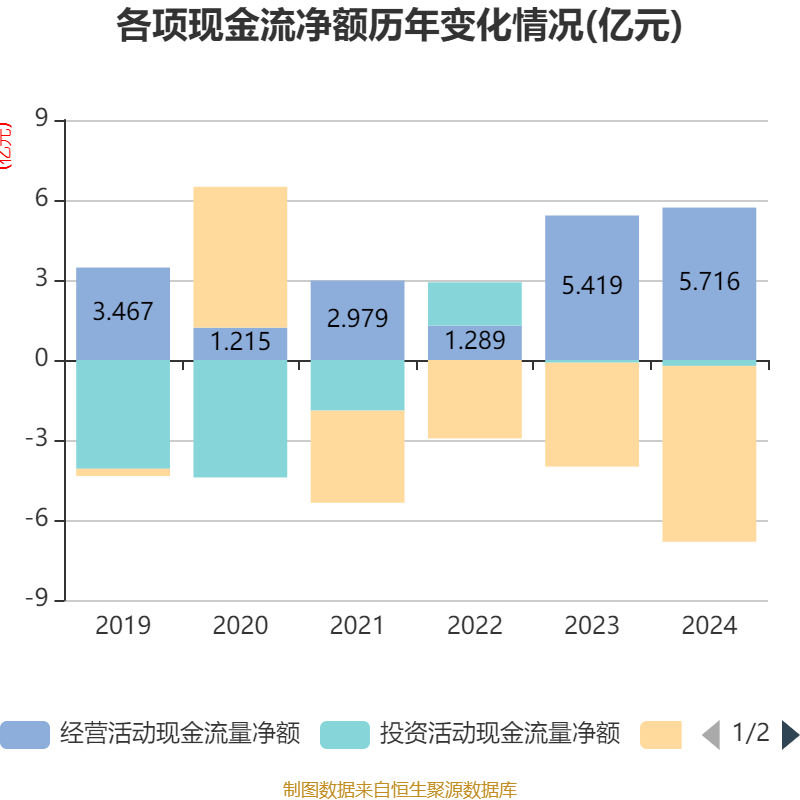 截至2024年,公司经营活动现金流净额为5.72亿元,同比增长5.47%;筹资活动现金流净额-6.6亿元,同比减少2.7亿元;投资活动现金流净额-2206.88万元,上年同期为-1012.07万元。