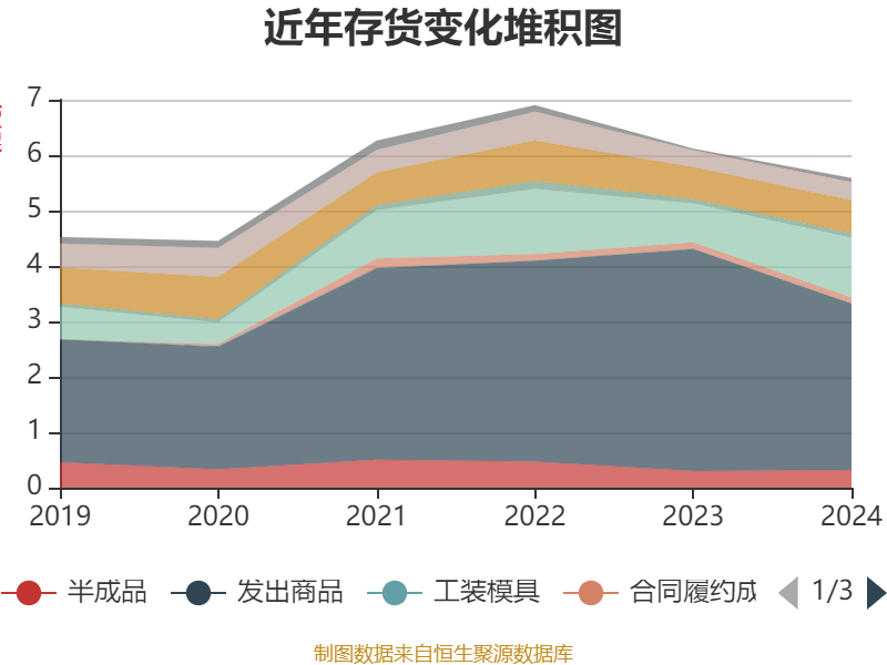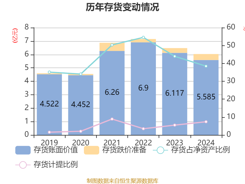 从存货变动来看,截至2024年末,公司存货账面价值为5.58亿元,占净资产的38.45%,较上年末减少5317.24万元。其中,存货跌价准备为4446.24万元,计提比例为7.37%。