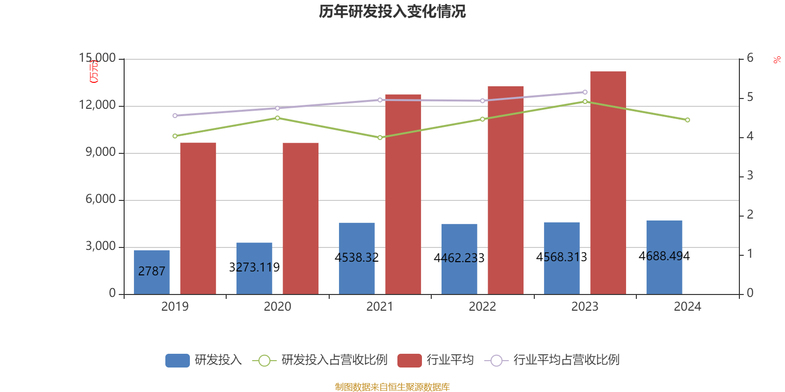 2024年全年,公司研发投入金额为4688.49万元,同比增长2.63%;研发投入占营业收入比例为4.44%,相比上年同期下降0.47个百分点。此外,公司全年研发投入资本化率为0%。