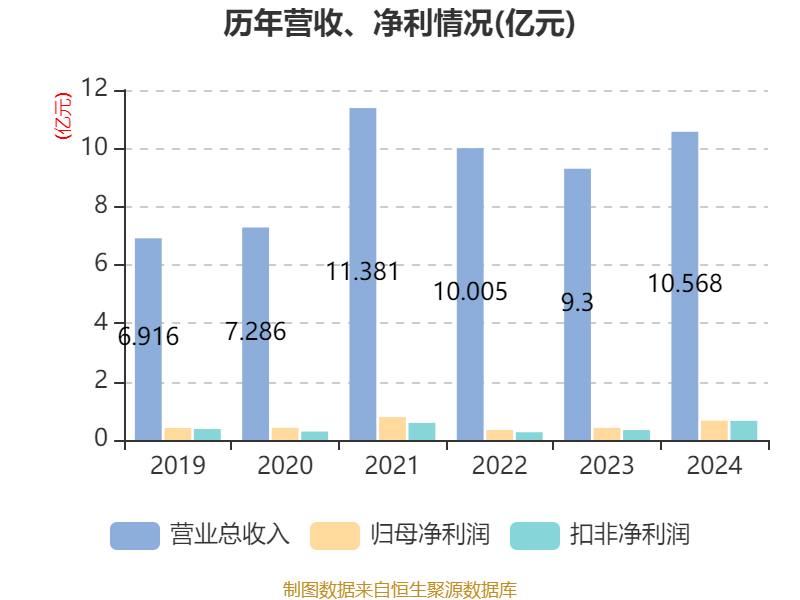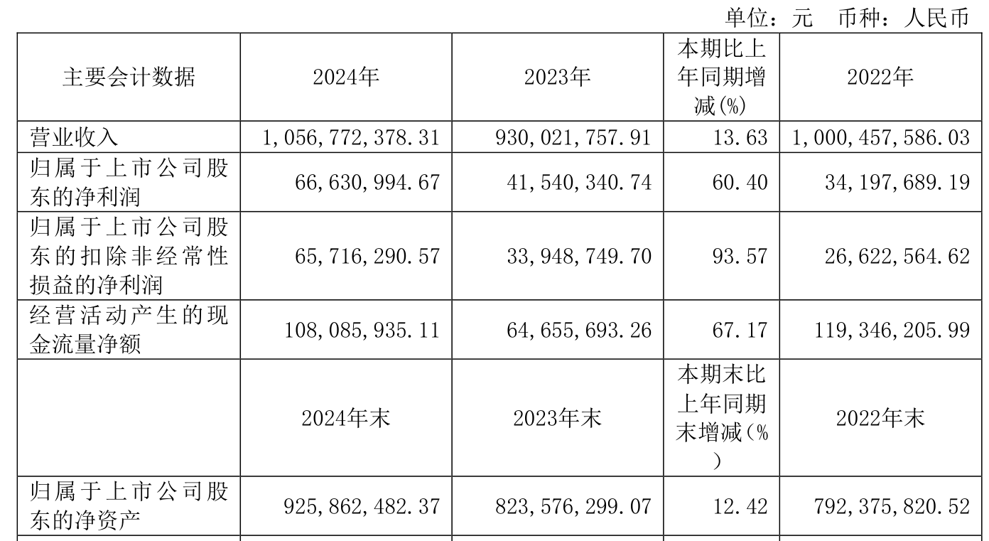 中证智能财讯迪贝电气(603320)4月17日披露2024年年度报告。2024年,公司实现营业总收入10.57亿元,同比增长13.63%;归母净利润6663.1万元,同比增长60.40%;扣非净利润6571.63万元,同比增长93.57%;经营活动产生的现金流量净额为1.08亿元,同比增长67.17%;报告期内,迪贝电气基本每股收益为0.51元,加权平均净资产收益率为8.10%。公司2024年度分配预案为:拟向全体股东每10股派现1.4元(含税)。