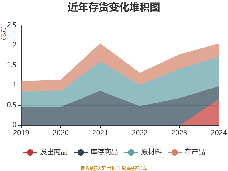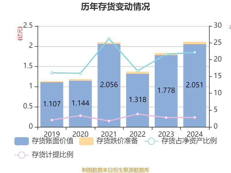 从存货变动来看,截至2024年末,公司存货账面价值为2.05亿元,占净资产的22.16%,较上年末增加2737.53万元。其中,存货跌价准备为590.73万元,计提比例为2.8%。