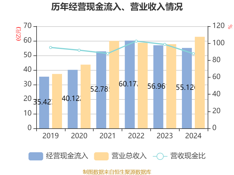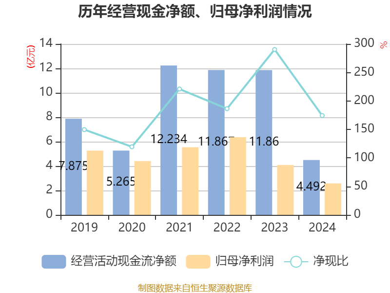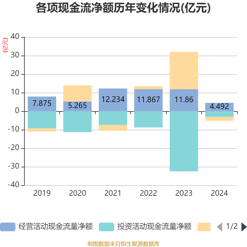 截至2024年,公司经营活动现金流净额为4.49亿元,同比下降62.12%;筹资活动现金流净额-2.11亿元,同比减少22.2亿元;投资活动现金流净额-3.06亿元,上年同期为-32.51亿元。