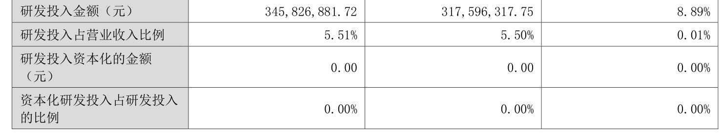 2024年全年,公司研发投入金额为3.46亿元,同比增长8.89%;研发投入占营业收入比例为5.51%,相比上年同期上升0.01个百分点。此外,公司全年研发投入资本化率为0%。