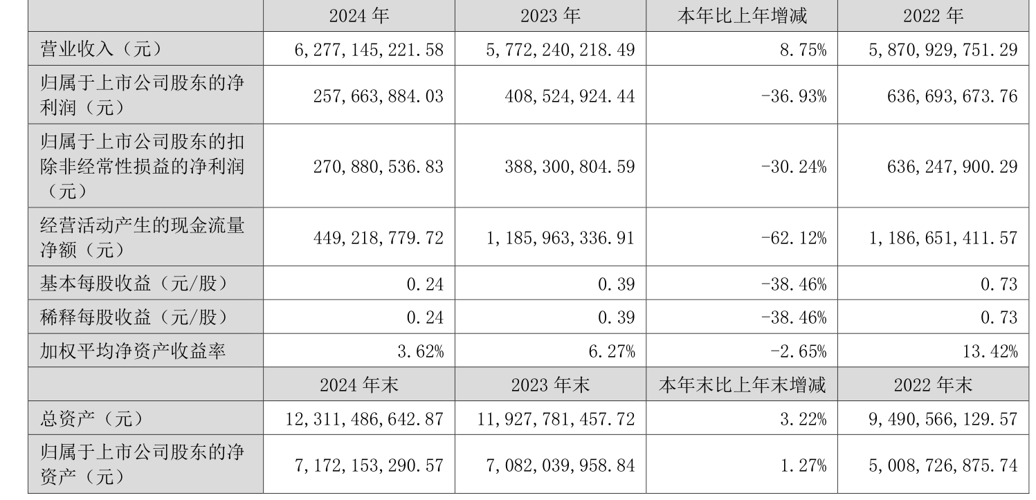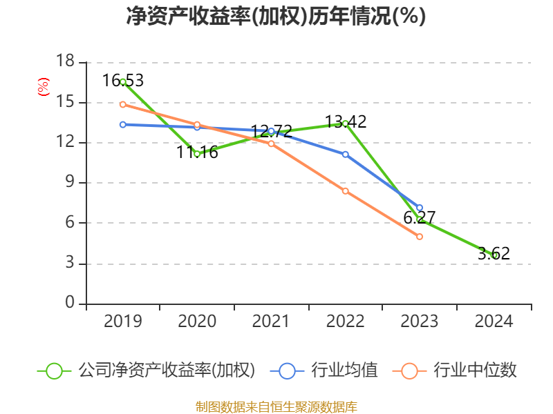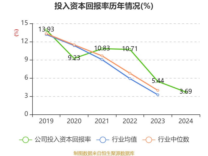 数据显示,2024年公司加权平均净资产收益率为3.62%,较上年同期下降2.65个百分点。公司2024年投入资本回报率为3.69%,较上年同期下降1.75个百分点。