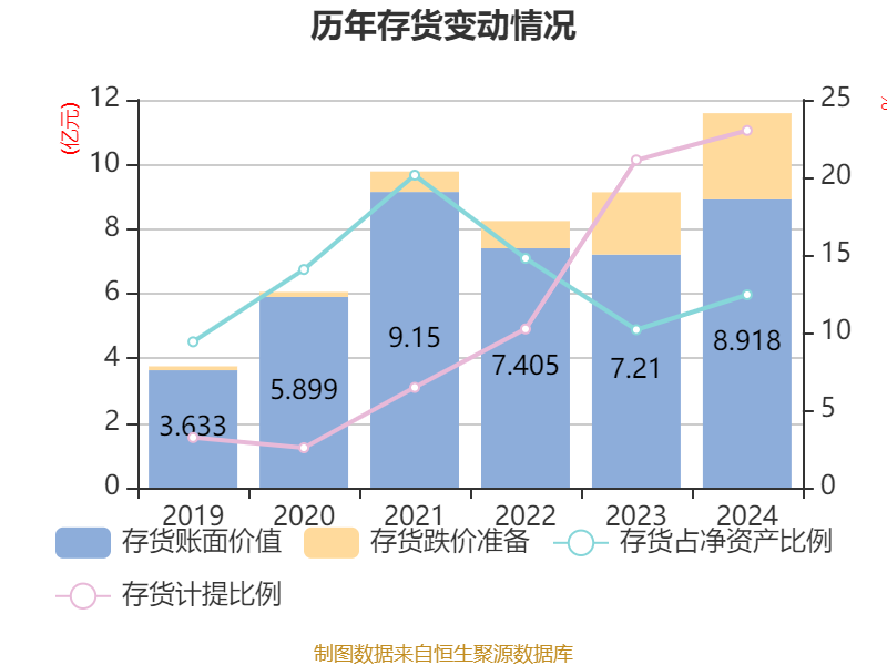 从存货变动来看,截至2024年末,公司存货账面价值为8.92亿元,占净资产的12.43%,较上年末增加1.71亿元。其中,存货跌价准备为2.67亿元,计提比例为23.02%。