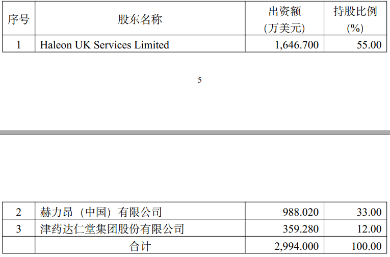 药融圈获悉:近期,津药达仁堂集团股份有限公司(以下简称“公司”)所属参股公司中美天津史克制药有限公司(以下简称“天津史克”)是一家中外合资有限责任公司,其股东构成为公司持有其12%股份、Haleon UKServices Limited(以下简称“赫力昂(英国)”)持有其55%股份、赫力昂(中国)有限公司(以下简称“赫力昂(中国)”)持有其 33%股份。