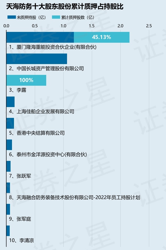 截止本公告日,股东厦门隆海重能投资合伙企业(有限合伙)已累计质押股份9747.13万股,占其持股总数的45.13%,股东李露已累计质押股份7031.25万股,占其持股总数的100.0%。本次质押后天海防务十大股东的累计质押股份占持股比例(占持股比例的计算以公司最新一期财务报表公布的十大股东的持股总数为基准)见下图: