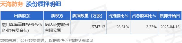 证券之星消息,天海防务(300008)4月18日公开信息显示,股东厦门隆海重能投资合伙企业(有限合伙)向信达证券股份有限公司合计质押5747.13万股,占总股本3.33%。质押详情见下表: