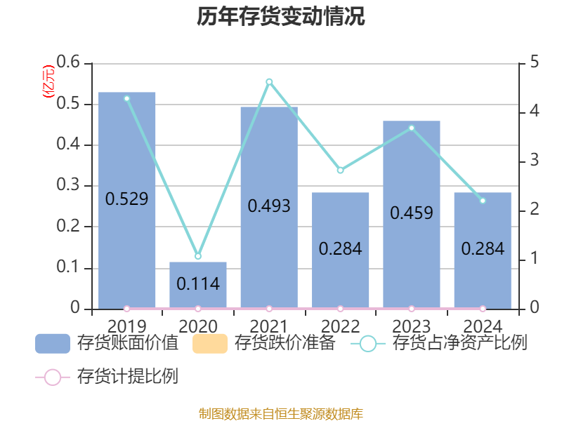 从存货变动来看,截至2024年末,公司存货账面价值为2835.9万元,占净资产的2.2%,较上年末减少1754.61万元。公司本期没有计提存货跌价准备。