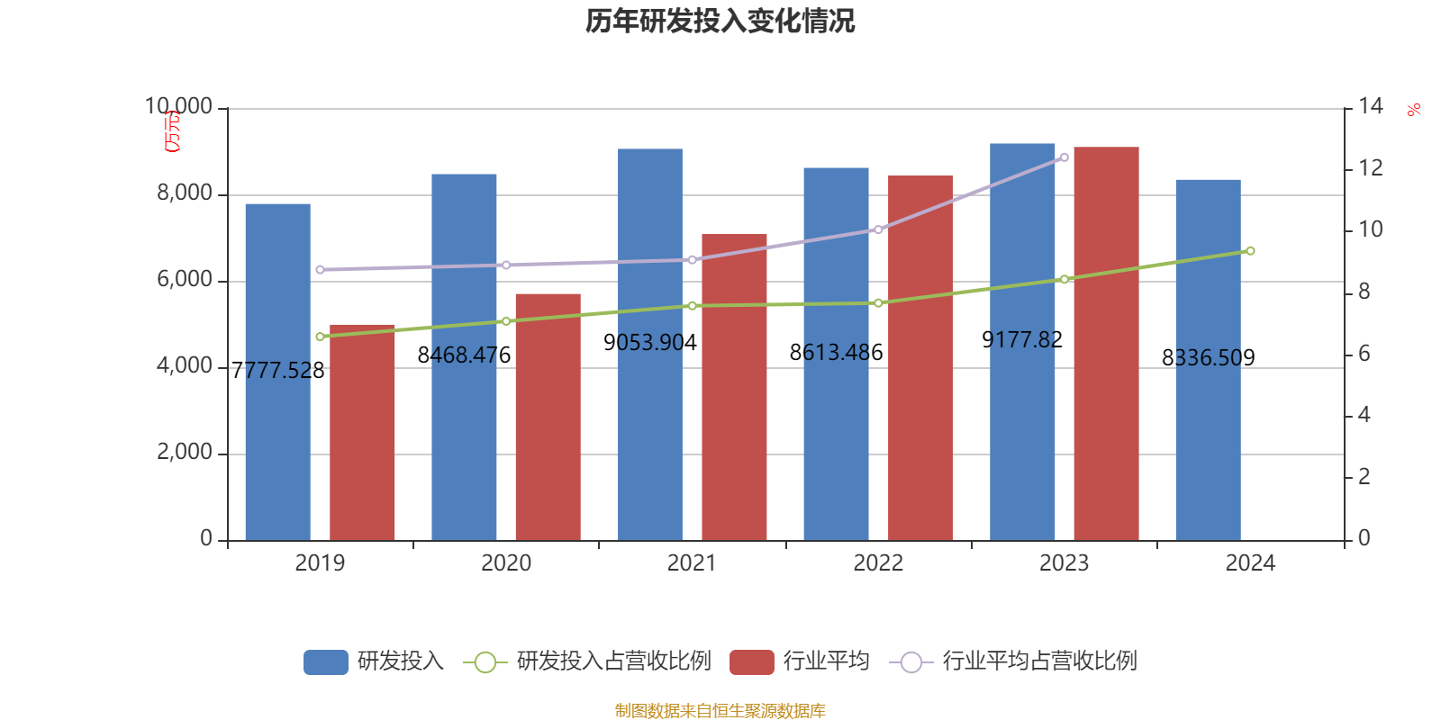 2024年全年,公司研发投入金额为8336.51万元,同比下降9.17%;研发投入占营业收入比例为9.37%,相比上年同期上升0.92个百分点。此外,公司全年研发投入资本化率为0%。