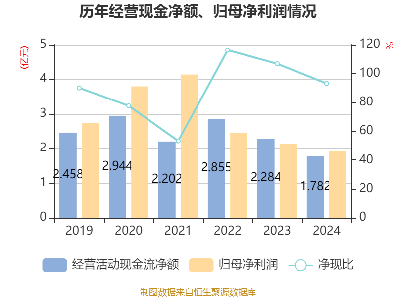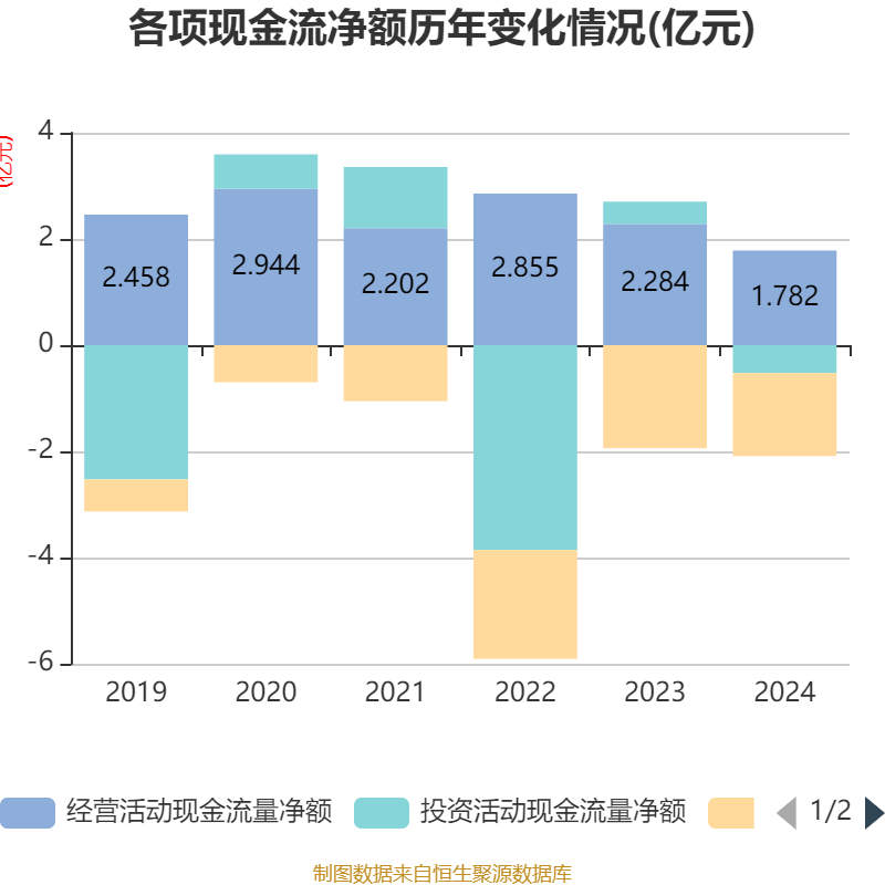 截至2024年,公司经营活动现金流净额为1.78亿元,同比下降21.95%;筹资活动现金流净额-1.56亿元,同比增加3745.27万元;投资活动现金流净额-5245.49万元,上年同期为4182.77万元。