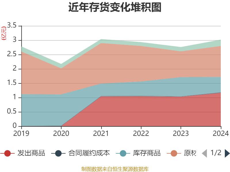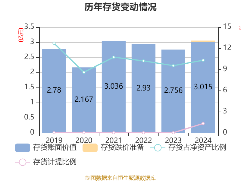 从存货变动来看,截至2024年末,公司存货账面价值为3.01亿元,占净资产的10.3%,较上年末增加2583万元。其中,存货跌价准备为401.36万元,计提比例为1.31%。
