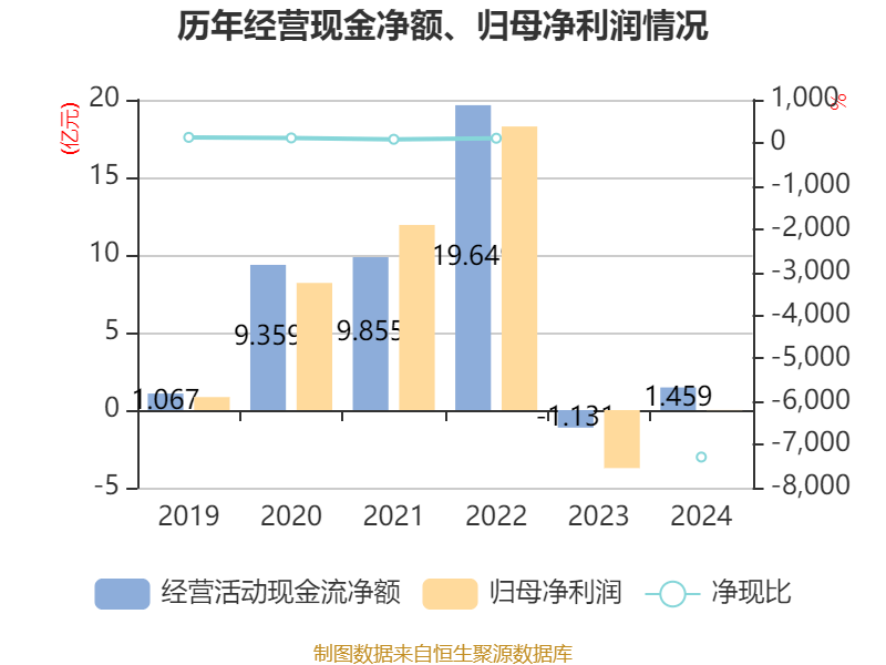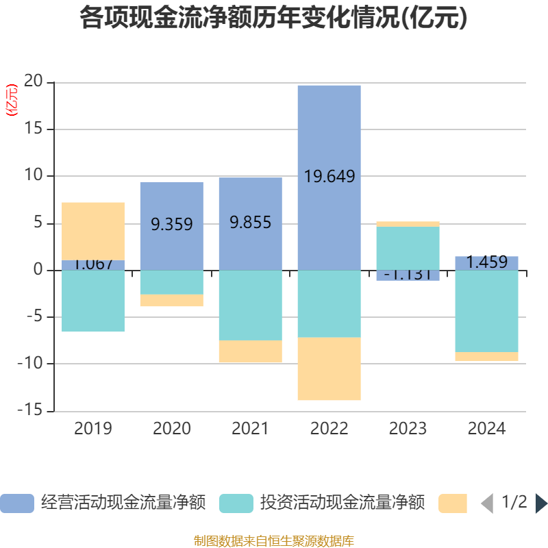 截至2024年,公司经营活动现金流净额为1.46亿元,同比增加2.59亿元;筹资活动现金流净额-9475.55万元,同比减少1.5亿元;投资活动现金流净额-8.73亿元,上年同期为4.62亿元。