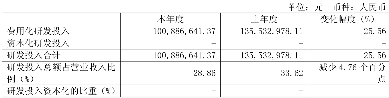 2024年全年,公司研发投入金额为1.01亿元,同比下降25.56%;研发投入占营业收入比例为28.86%,相比上年同期下降4.76个百分点。