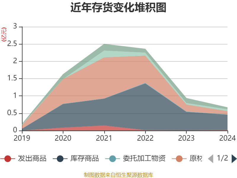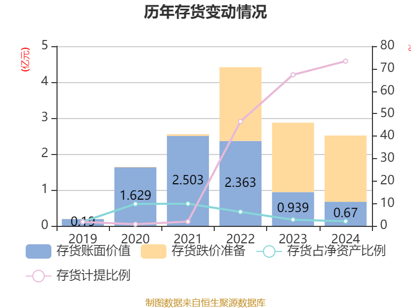 从存货变动来看,截至2024年末,公司存货账面价值为6704.48万元,占净资产的2.06%,较上年末减少2681.51万元。其中,存货跌价准备为1.84亿元,计提比例为73.34%。