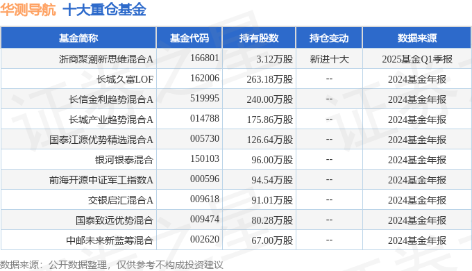 持有华测导航最多的基金为浙商聚潮新思维混合A,目前规模为0.61亿元,最新净值2.811(4月18日),较上一交易日下跌0.14%,近一年上涨28.81%。该基金现任基金经理为成子浩。
