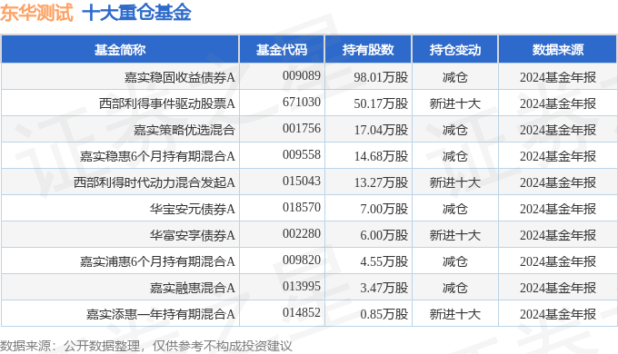 持有东华测试最多的基金为嘉实稳固收益债券A,目前规模为26.88亿元,最新净值1.153(4月18日),较上一交易日下跌0.09%,近一年上涨0.65%。该基金现任基金经理为胡永青。